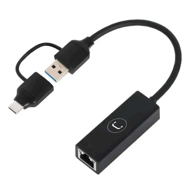 El adaptador 2 en 1 UNNO TEKNO AD3007BK USB-A USB-C Dual a Gigabit Ethernet ofrece una conexión rápida y estable de hasta 1Gbps. Ideal para mejorar la conectividad de tus dispositivos USB-A y USB-C. Diseño negro elegante y compacto de alta calidad.